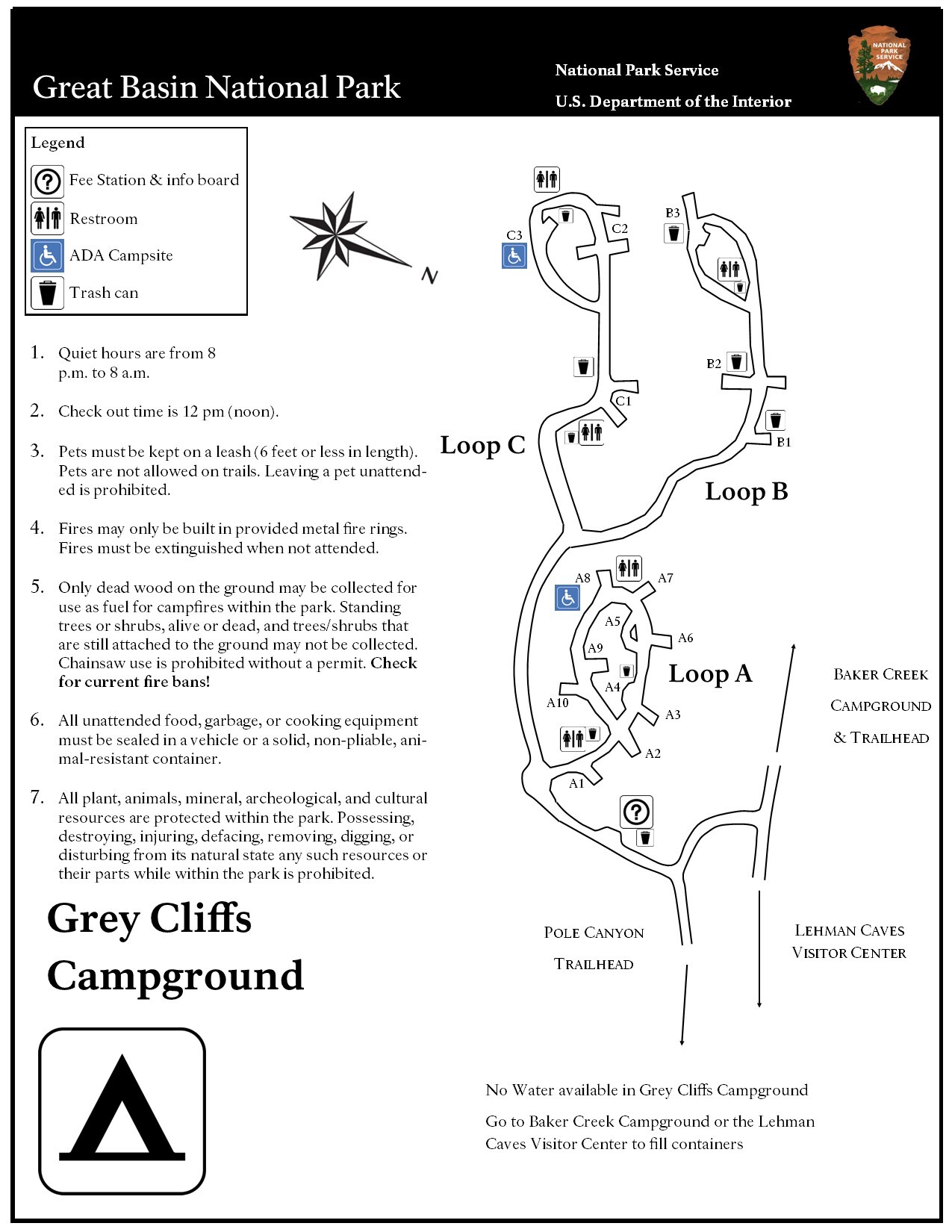 Grey Cliffs Campground is a small campground located in the lower elevations of Great Basin National Park. Positioned along the park’s entrance road near the Baker area, it provides convenient access for visitors arriving from the nearby town while still offering a quiet desert-edge camping experience. Its proximity to park services and attractions makes it a practical option for campers looking for easy access without traveling far into the park’s mountain roads.